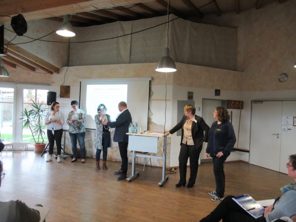 Zum Abschluss fassten im Plenum Teilnehmer oder Referenten die Workshops noch einmal zusammen. Die liebevoll gestalteten Geschenkpäckchen mit Produkten aus dem Atelier wurden als Dankeschön für das Engagement der Referenten überreicht und Frau Röbke als Organisatorin des Tages erhielt noch einen Blumenstrauß für ihren Einsatz.