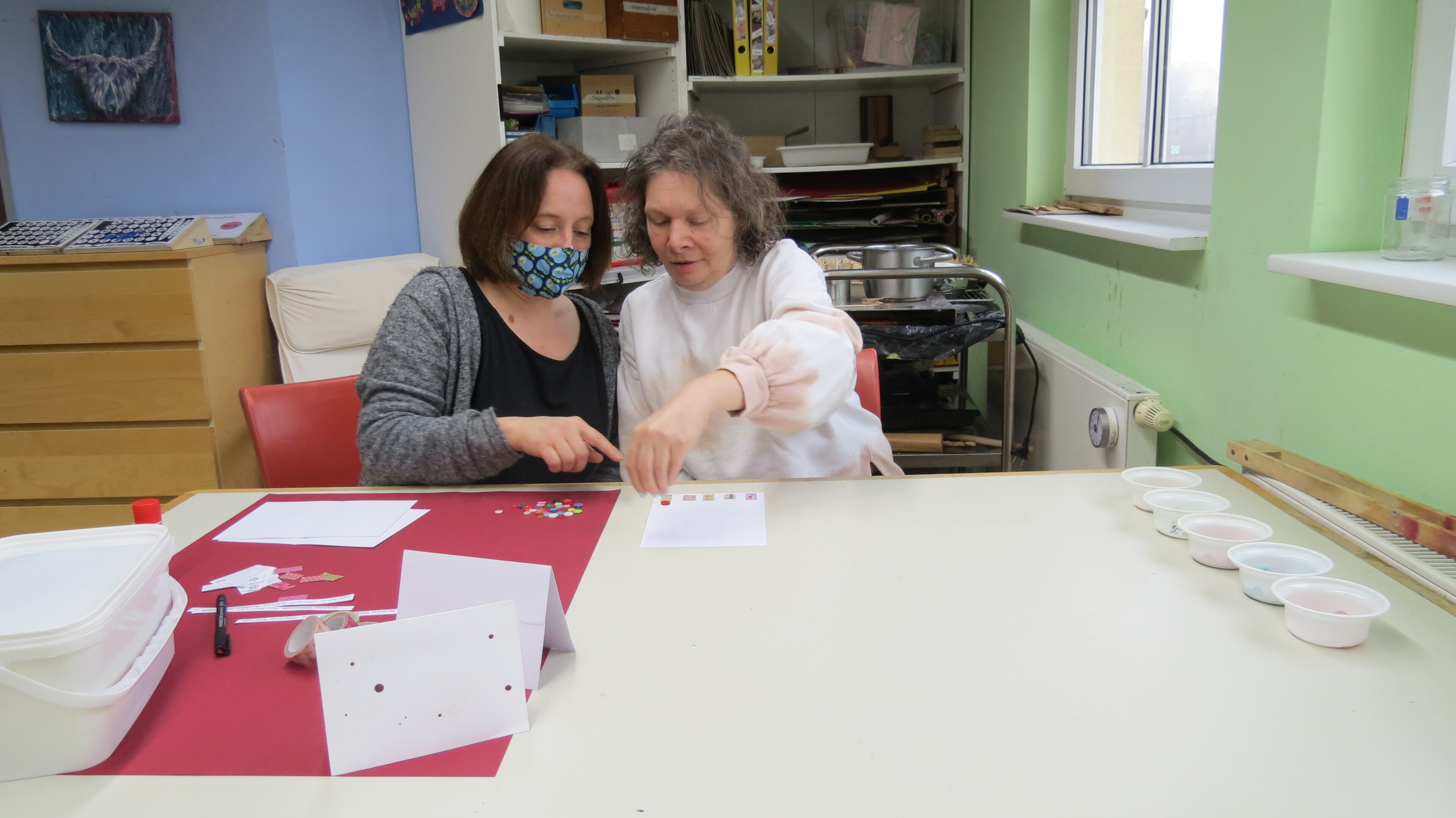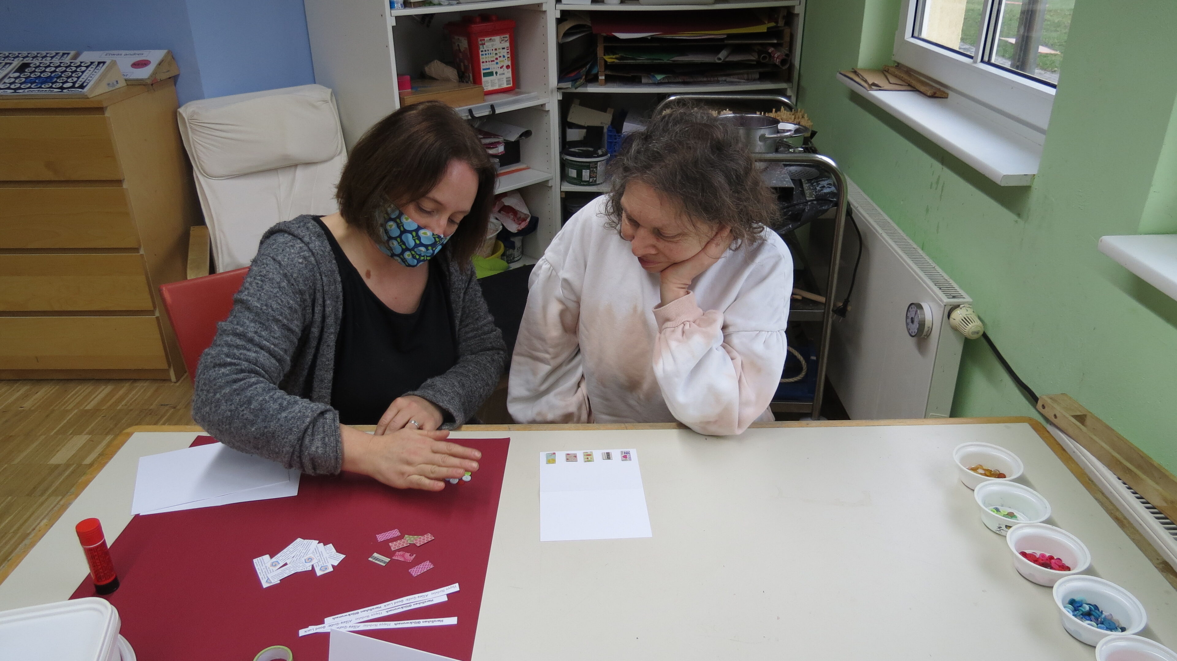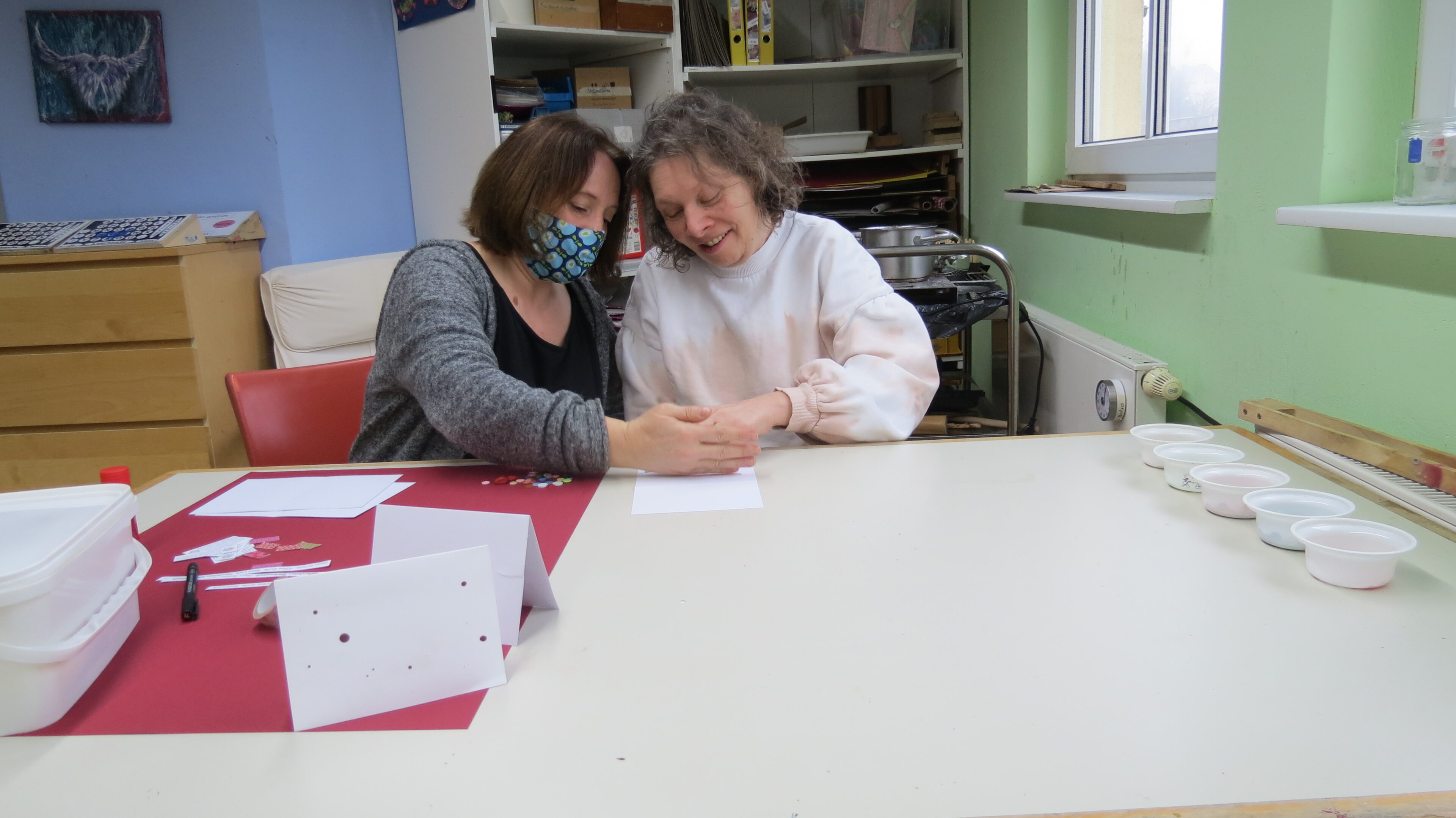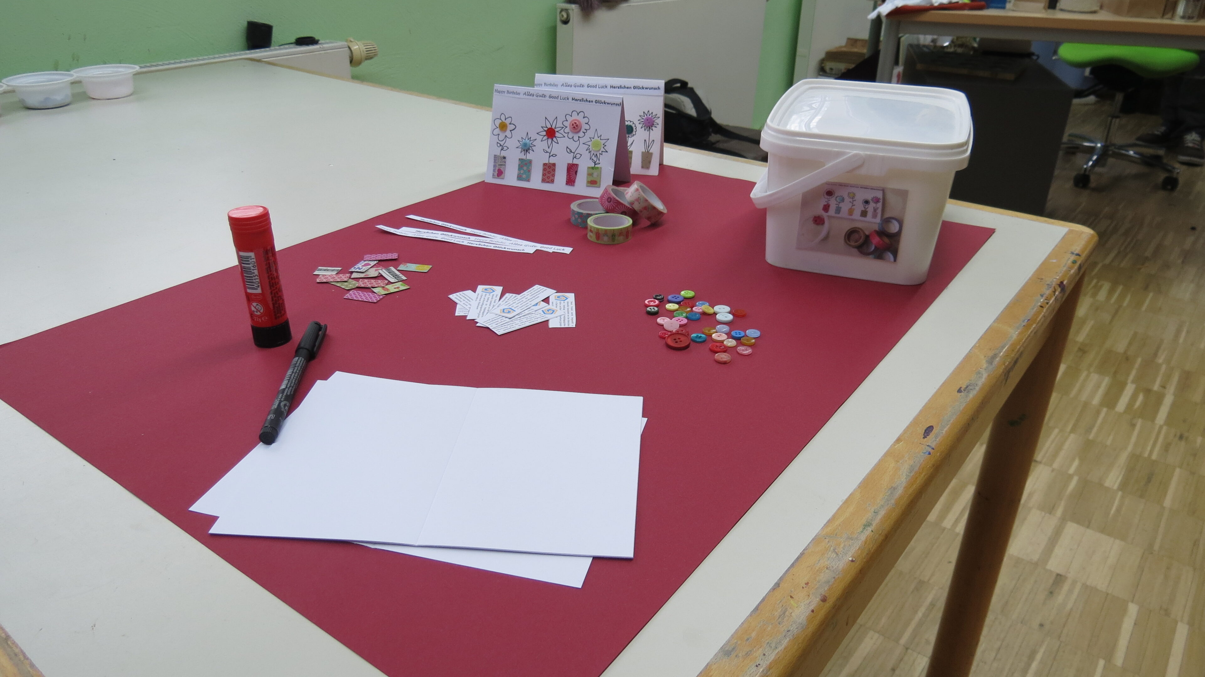 Aus Papierresten werden Schnipsel für die Untertöpfe geschnitten, kleine Streifen mit Glückwünschen werden am PC geschrieben, ausgedruckt, ausgeschnitten und aufgeklebt. Durch viele kleine Tätigkeiten können viele Klienten an den Karten mitwirken und der Stolz, wenn sie von Mitarbeitern auf ihre tollen Karten angesprochen werden, ist riesig.