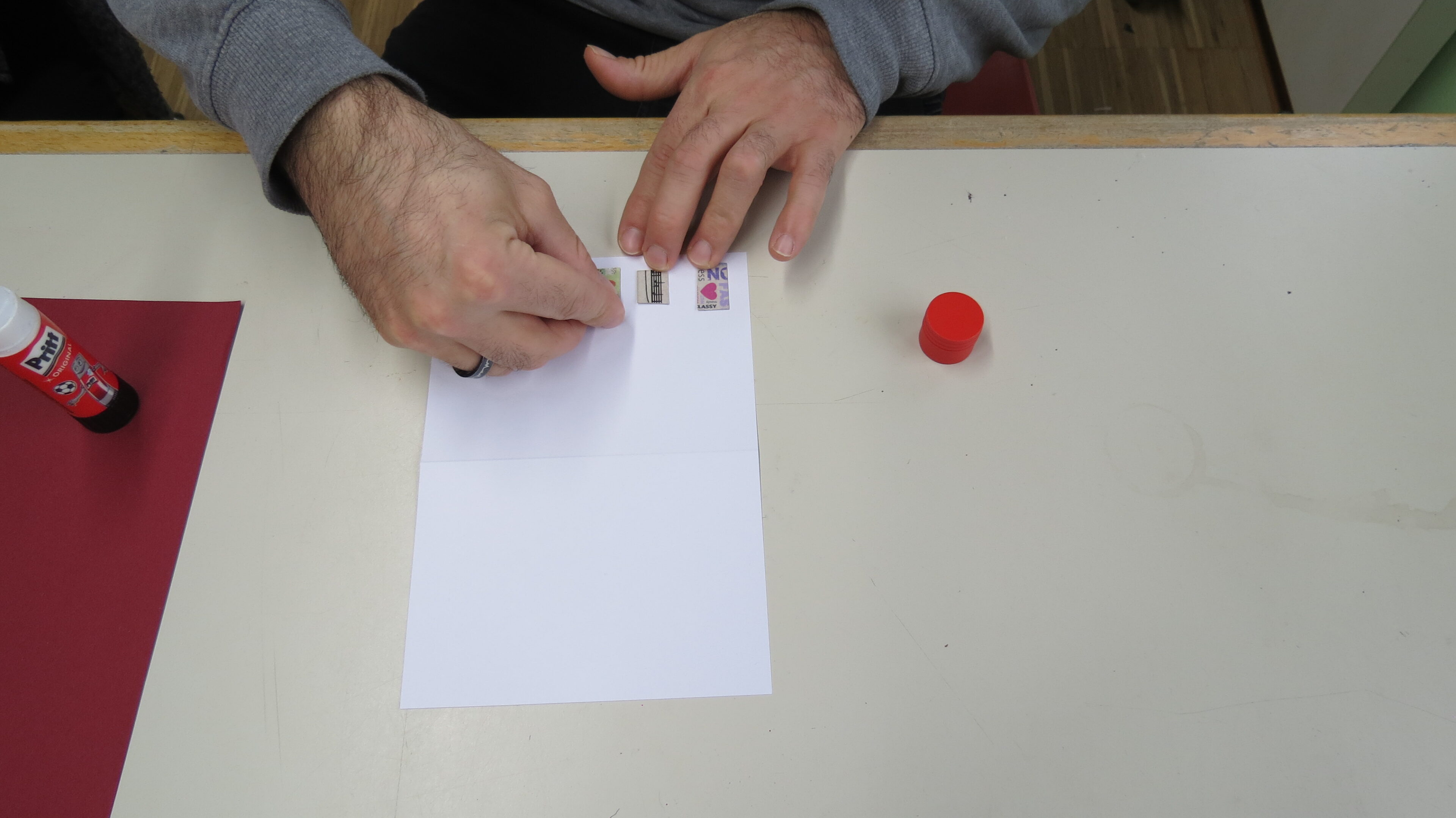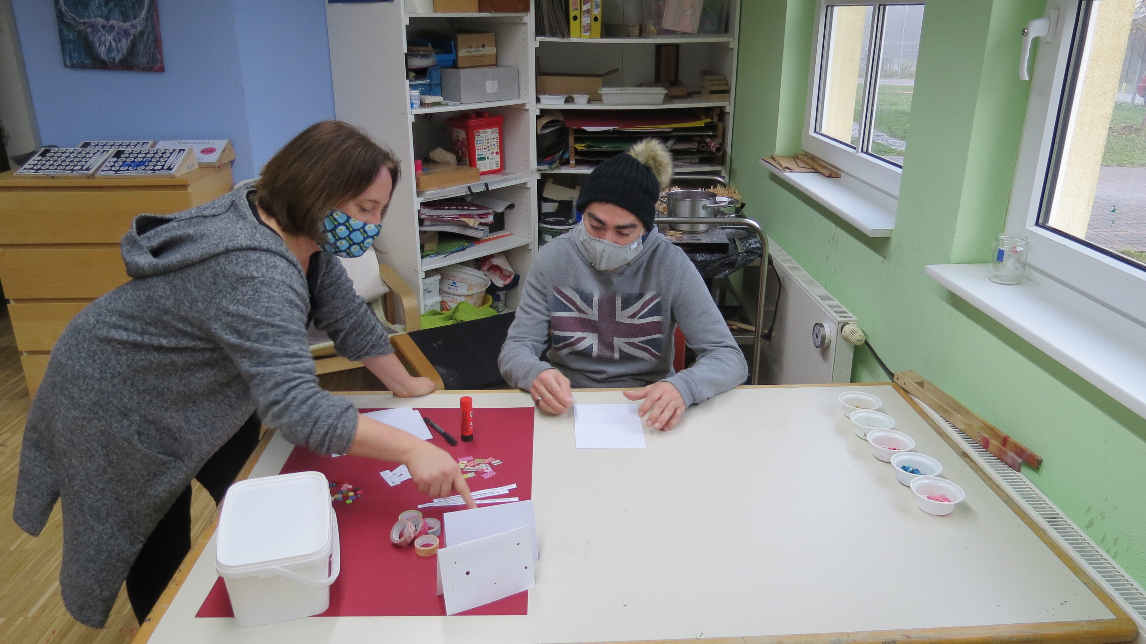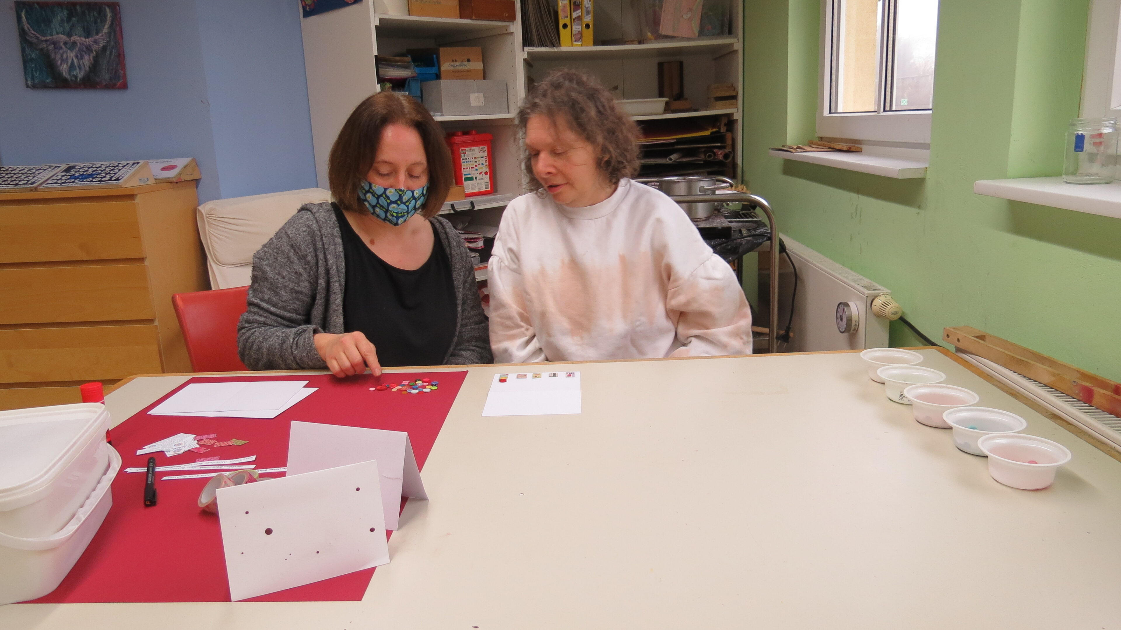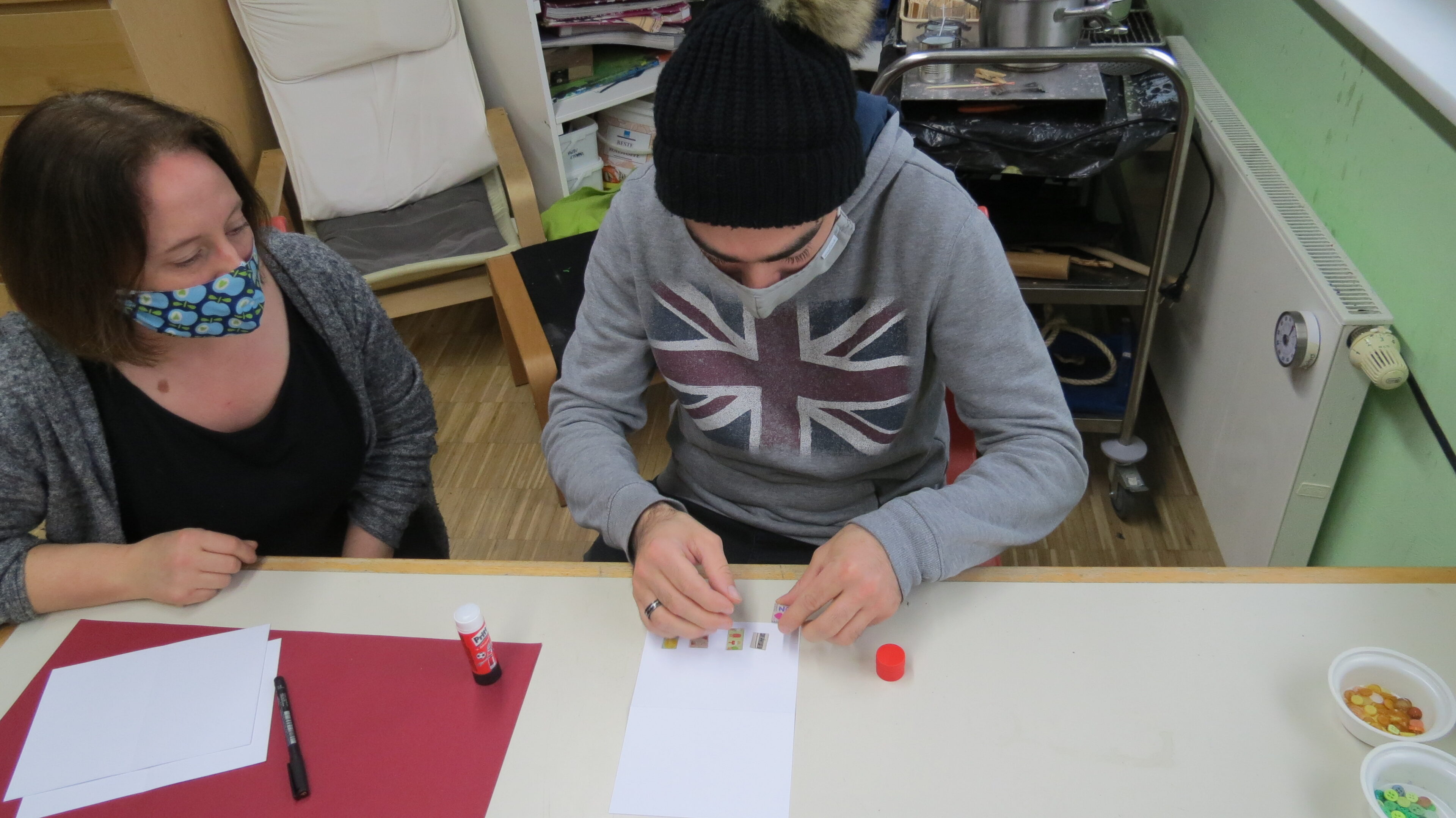 Aus Papierresten werden Schnipsel für die Untertöpfe geschnitten, kleine Streifen mit Glückwünschen werden am PC geschrieben, ausgedruckt, ausgeschnitten und aufgeklebt. Durch viele kleine Tätigkeiten können viele Klienten an den Karten mitwirken und der Stolz, wenn sie von Mitarbeitern auf ihre tollen Karten angesprochen werden, ist riesig.