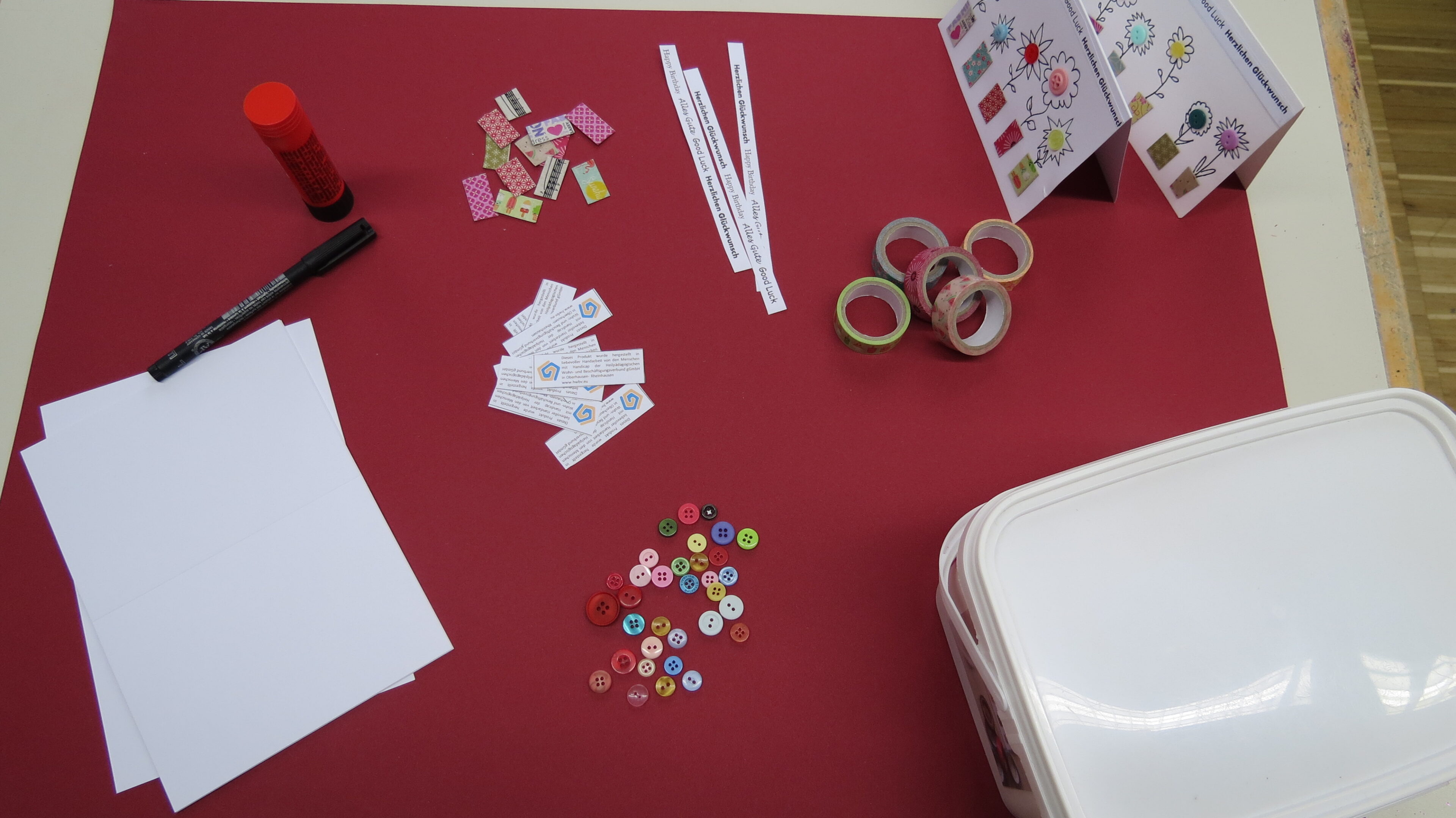 Seit dem letzten Jahr freuen sich unsere Mitarbeiter sehr über die Geburtstagskarten aus eigener Herstellung. Im Kreativatelier Oberhausen werden mit verschiedenen Teilschritten und Aufgaben von den Klienten die Glückwunschkarten für die Mitarbeiter hergestellt.