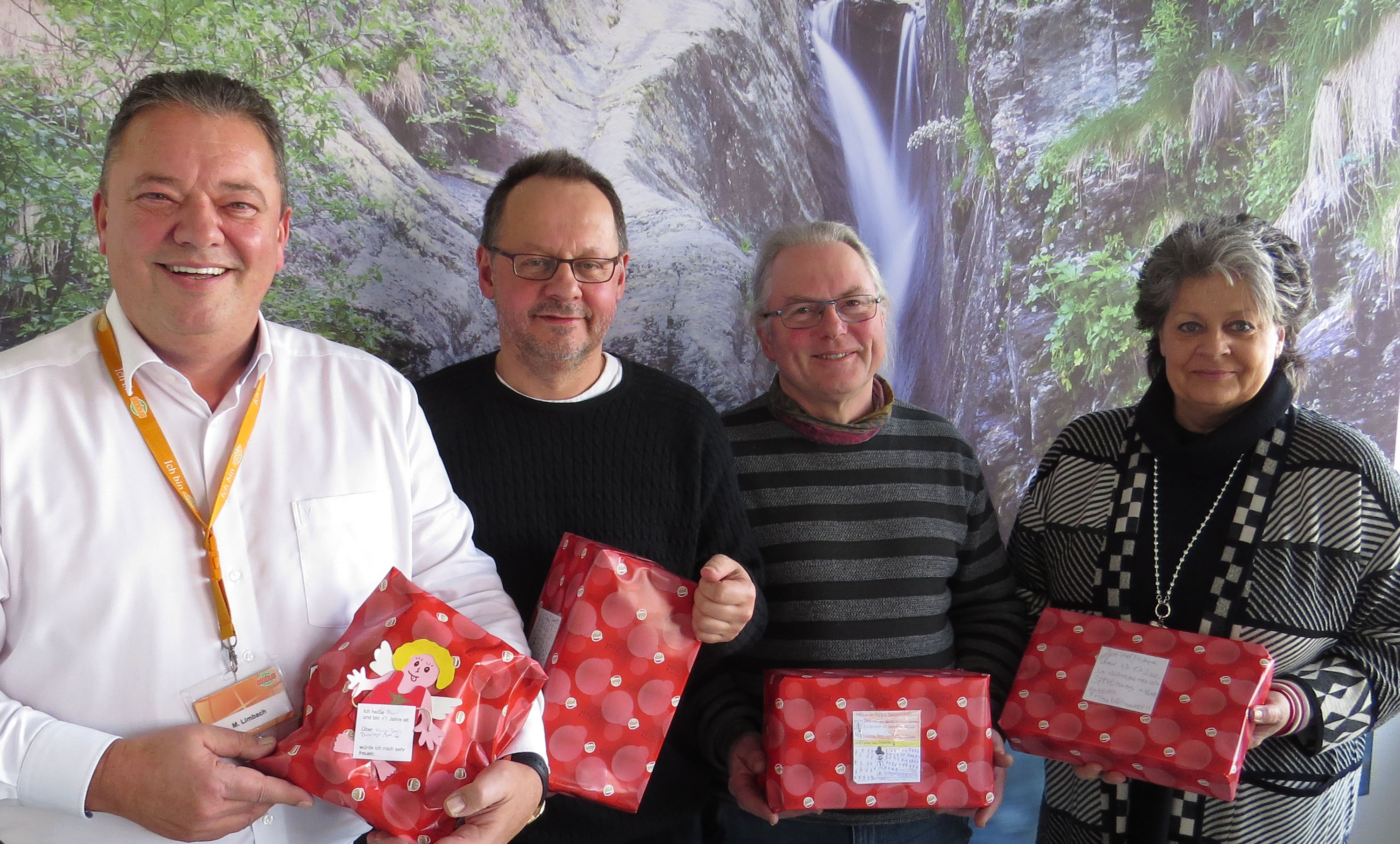 Auch in diesem Jahr möchten wir uns ganz herzlich bei Globus Wiesental bedanken, der zusammen mit Mitarbeitern und Kunden seit Jahren dafür sorgt, dass die Bewohner des HWBV in Oberhausen Geschenkwünsche erfüllt bekommen. Zusammen mit Herrn Fleischmann (2.v.l.), dem Gesamtleiter des Kinderhauses St. Raphael nahmen Herr Ruck (3.v.l.), der Atelierleiter Oberhausen und Frau Schweigert als Koordinatorin aus der Verwaltung die vielen schönen Geschenke von Herrn Libmach dem Geschäftsleiter in Empfang.